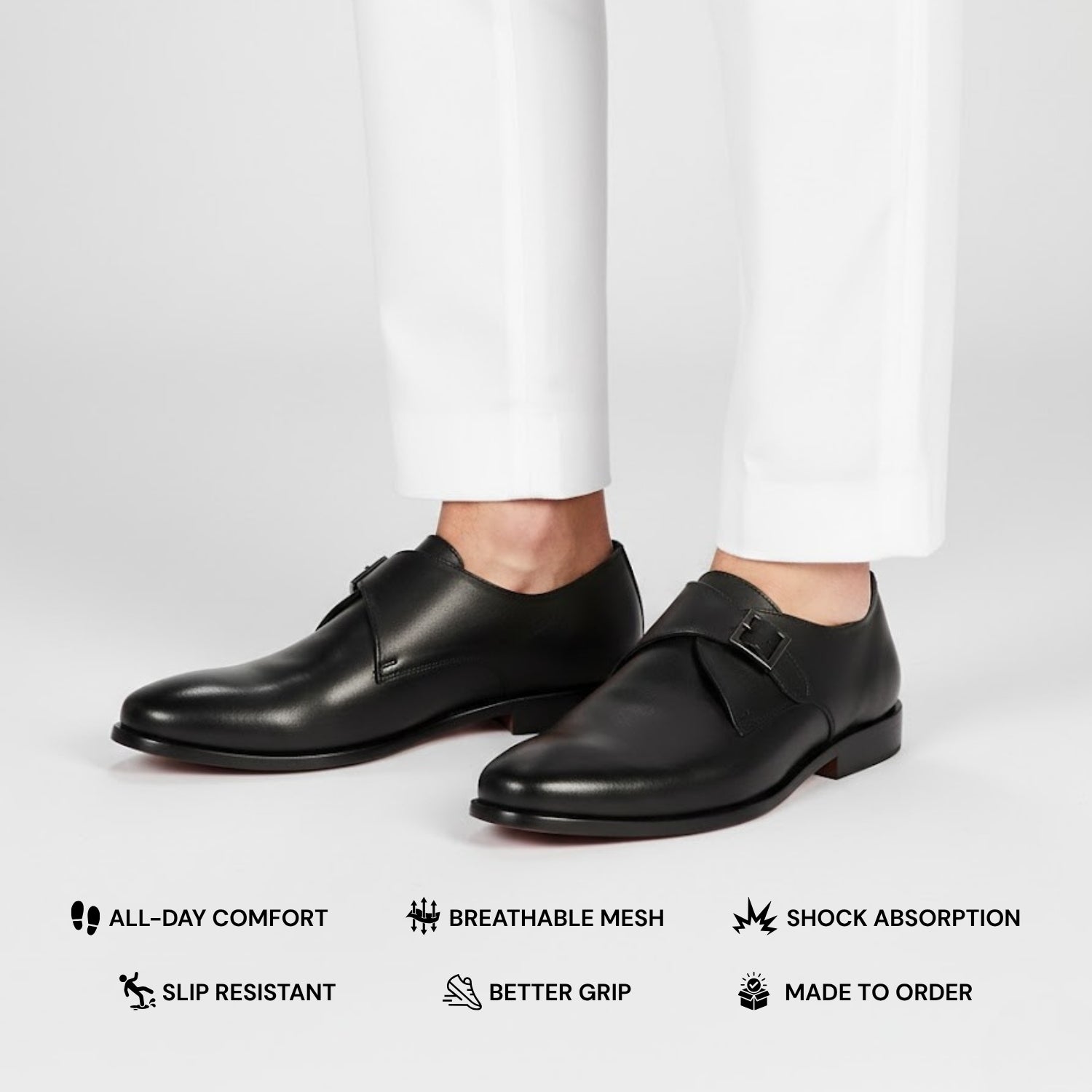 The Aryaki Leather & Lux – Single Strap Monk is a timeless classic, redefined for today’s gentleman. Expertly handcrafted from premium finished leather, this elegant monk strap shoe features a single buckle closure that adds refined simplicity and
