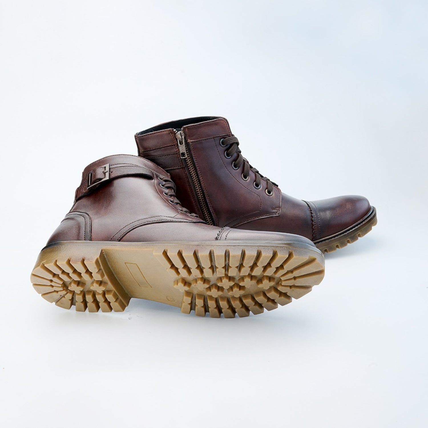 The Aryaki Leather & Lux – Toe Cap Jimping Buckle Boot delivers both visual impact and all-day comfort. Crafted from premium handpainted leather, each boot showcases unique tonal depth and artisanal craftsmanship. The toe cap design enhances durability, while the jimping buckle strap adds a bold, functional accent for a secure fit and striking look.